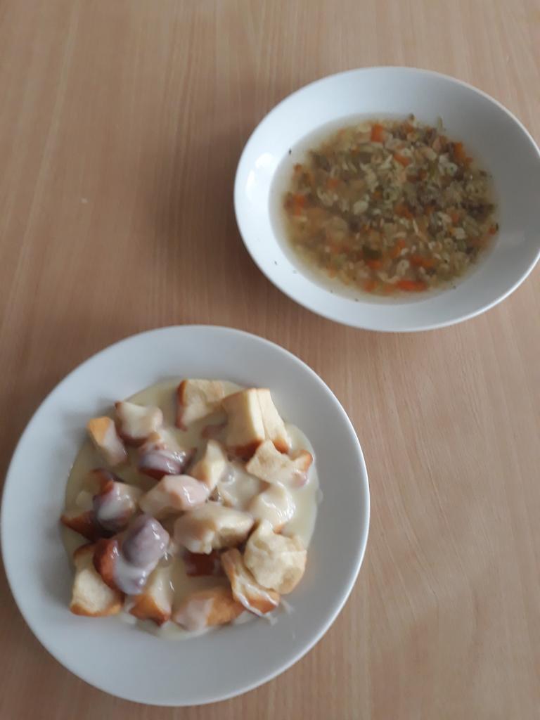 Hovězí vývar s těstovinou, dukátové buchtičky s vanilkovým krémem